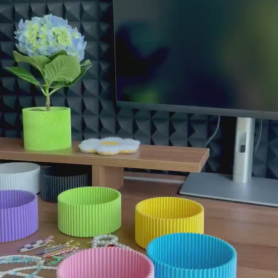 Ši aukštesnė, cilindro formos dėžutė – puikus pasirinkimas tiems, kurie nori ne tik stilingai, bet ir patogiai laikyti daugiau daiktų. Ryškios spalvos ir banguotas paviršius suteikia jai žaismingumo, o praktiška forma leidžia talpinti įvairias smulkmenas – nuo biuro reikmenų iki kosmetikos ar papuošalų. Dėžutė yra sustatoma, todėl lengvai jungiasi su kitomis mūsų kolekcijos dėžutėmis, leisdama kurti savo tvarkos sistemą, kuri atrodo lyg spalvotas dizaino akcentas.